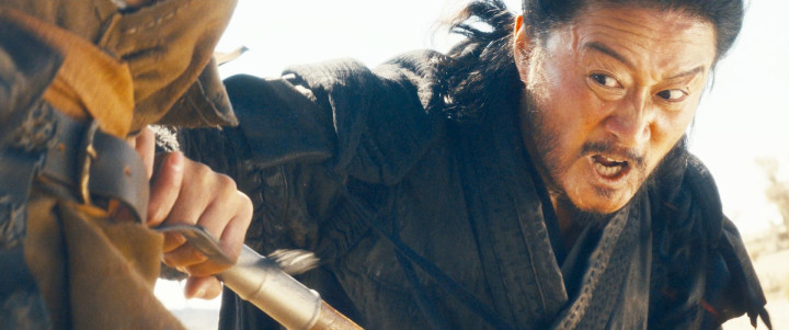 吴京上演的刀马,在漫天沙尘中,猛然一个飞身上马。