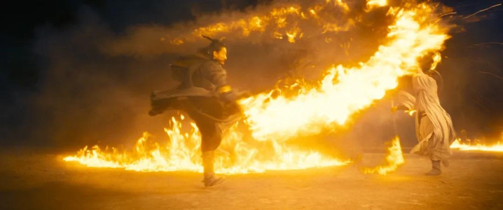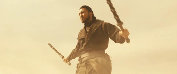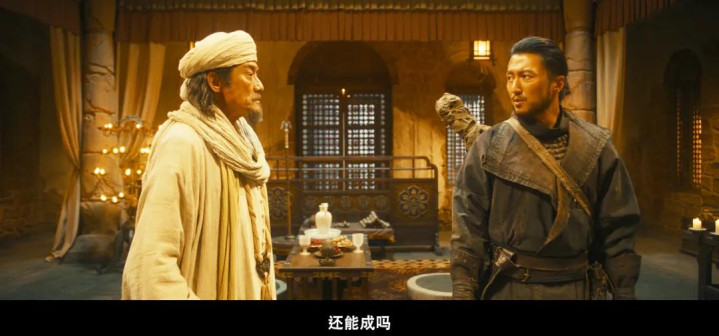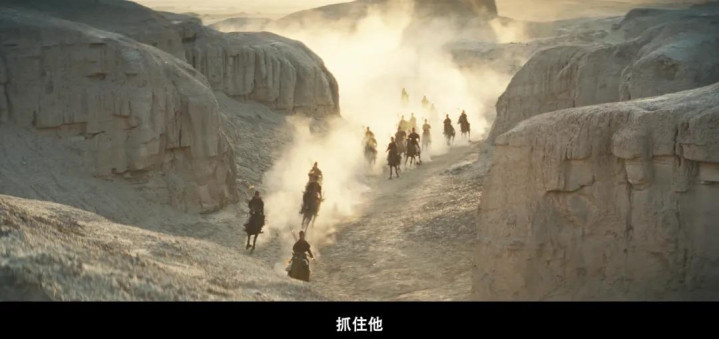 紧接着即是立时追赶战,几匹骏马在黄沙中决骤,演员们在马背上挥刀格挡、翻身诡秘,马蹄扬起的尘土和刀光剑影交汇在全部。