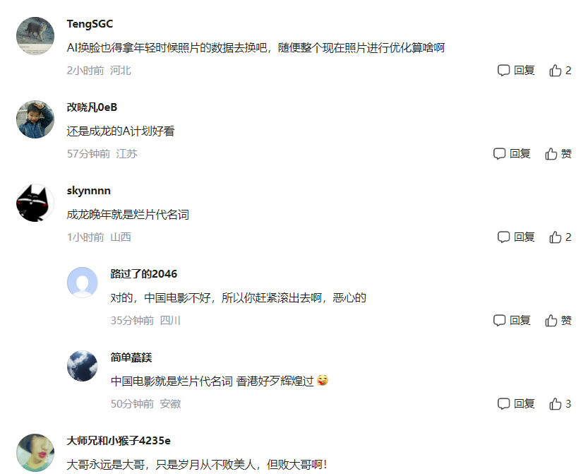 为了齐备呈现“陈造就”年青时的仪态,剧组不吝重金引入了先进的AI换脸技艺,费力让成龙在银幕上重现其芳华岁月。然则,这一技艺尝试并未如预期般获取无为嘉赞。跟着影片的上映,收罗上对于成龙“回春”后果的扣问赶快升温,不少不雅众和网友纷纷抒发了我方的主张。