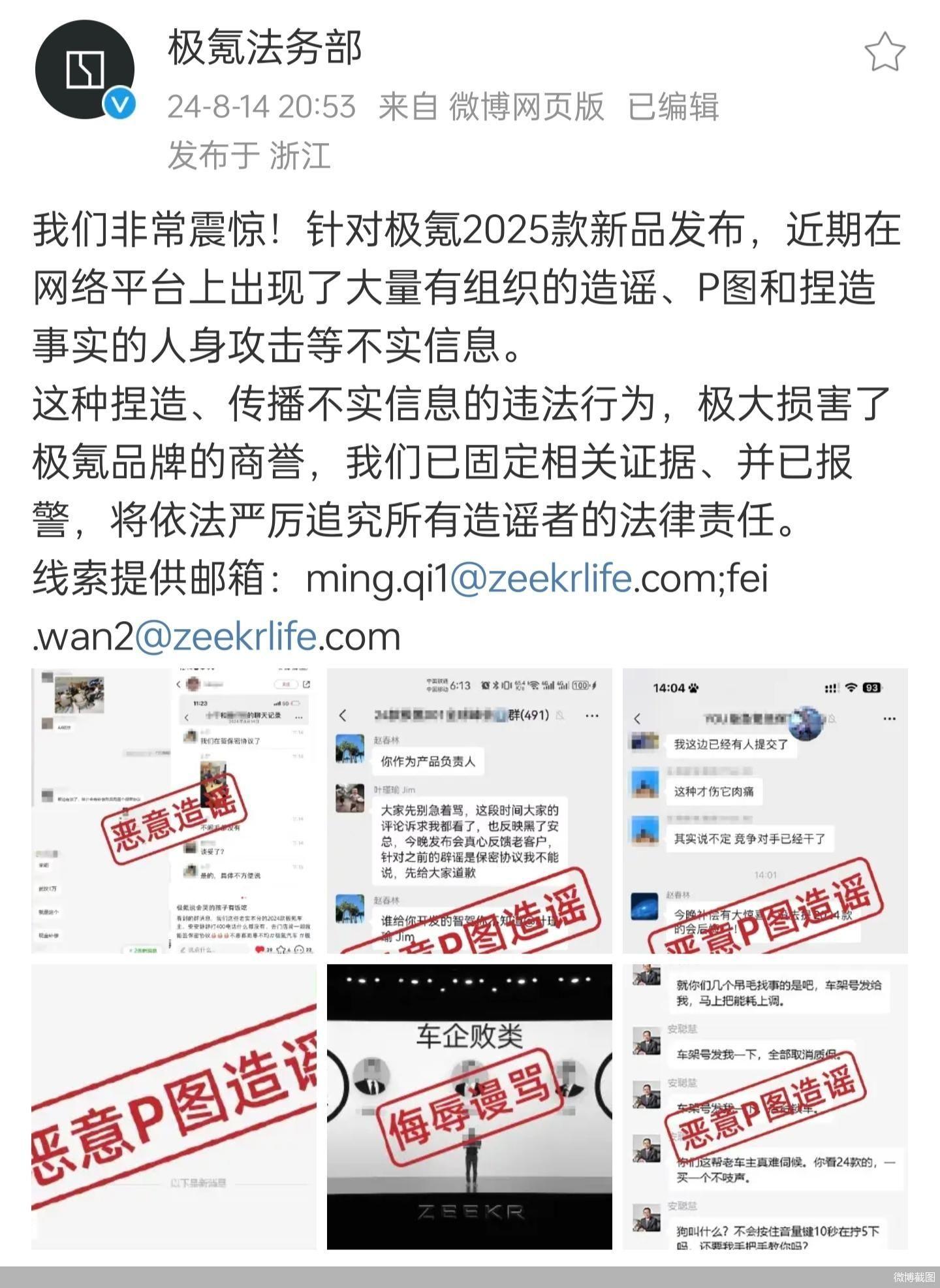 北京商报讯(记者 刘晓梦)8月14日晚,极氪法务部发布声明称,针对极氪2025款新品发布,近期在集中平台上出现大批有组织的杜撰、P图和握造事实的东谈主身膺惩等乌有信息。公司已固定有关笔据并已报警,将照章严厉讲究悉数杜撰者的法律牵累。