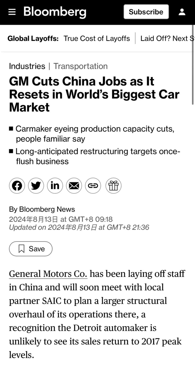 8月初,联系通用汽车在华裁人、削减产能的听说运转流传。据彭博社报谈,通用汽车正在对与中国阛阓关连的部门进行裁人,其中就包括研发部门在内。同期通用汽车还打算与上汽集团究诘可能的产能削减问题。音书一出,一石激起千层浪。