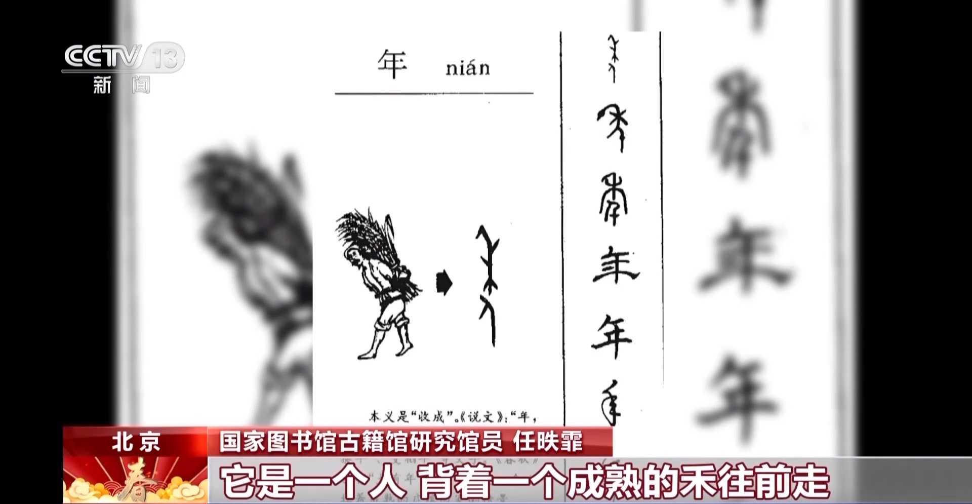 国度藏书楼古籍馆盘考馆员 任昳霏:“年”最早在甲骨文内部字形是一个东说念主,背着一个闇练的禾往前走,《春秋谷梁传》里有这么的一个说法,叫作五谷王人熟曰有年,五谷大熟曰大有年,“年”的意味和丰充照旧挂在一说念的。