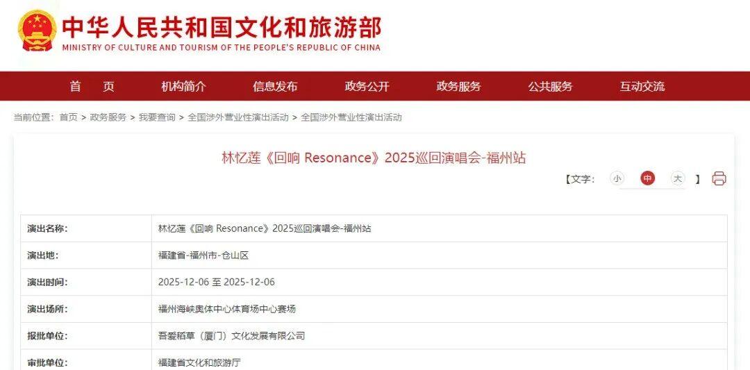 据福建省文化和旅游厅官网音信,林忆莲《回响 Resonance》2025巡回演唱会行将在福州举办。