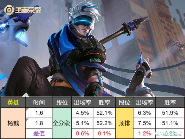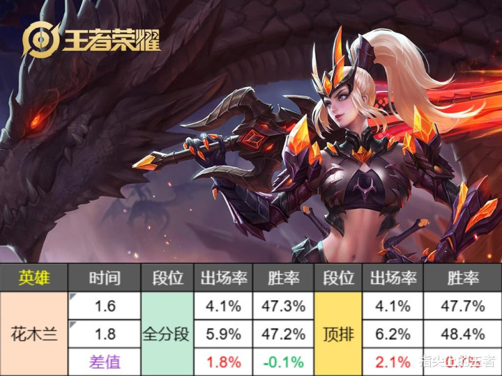 因为巅峰赛并莫得开启,是以只对比了全分段和顶排的数据,不错看到,出场率均有涨幅,但更多的是因为妙手左迁下来,能玩领会花木兰的就相比少了,而胜率略有涨幅,暂时来看影响不大。
