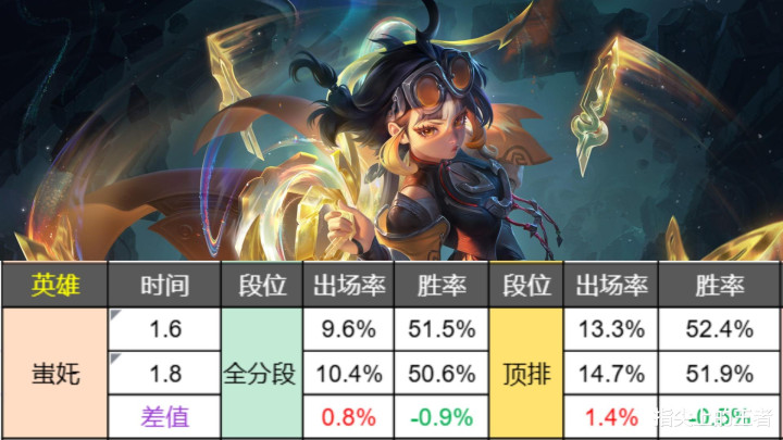 平缓了大招的攻速后强度略有镌汰,出场率涨了少许点,胜率略有镌汰,但不及1%的胜率降幅,果真莫得看起来平缓的严重,毕竟蚩奼的总攻速很高,平缓这少许影响并不大。