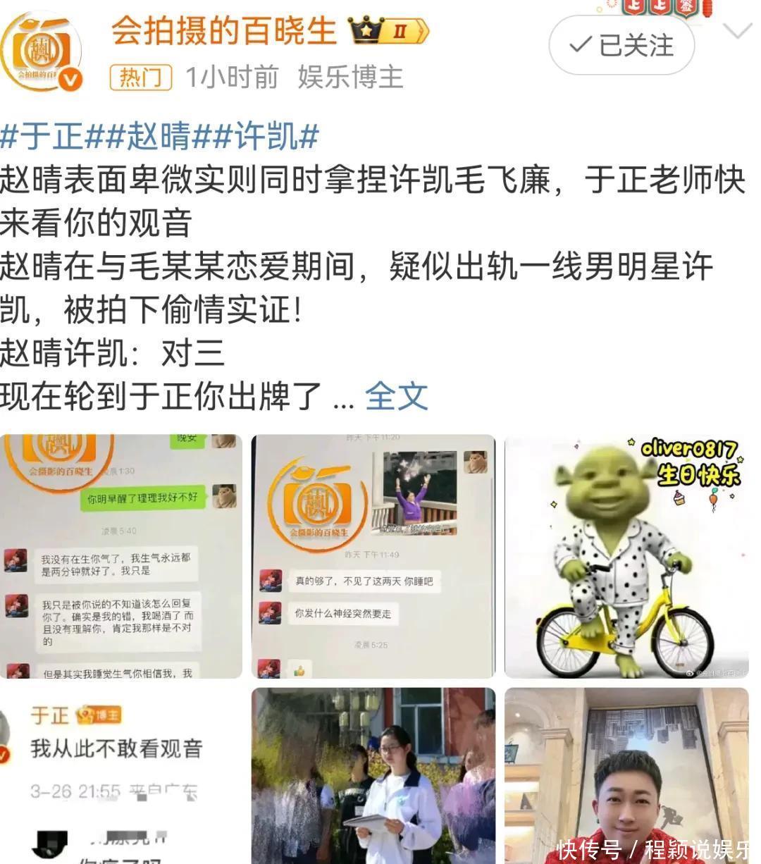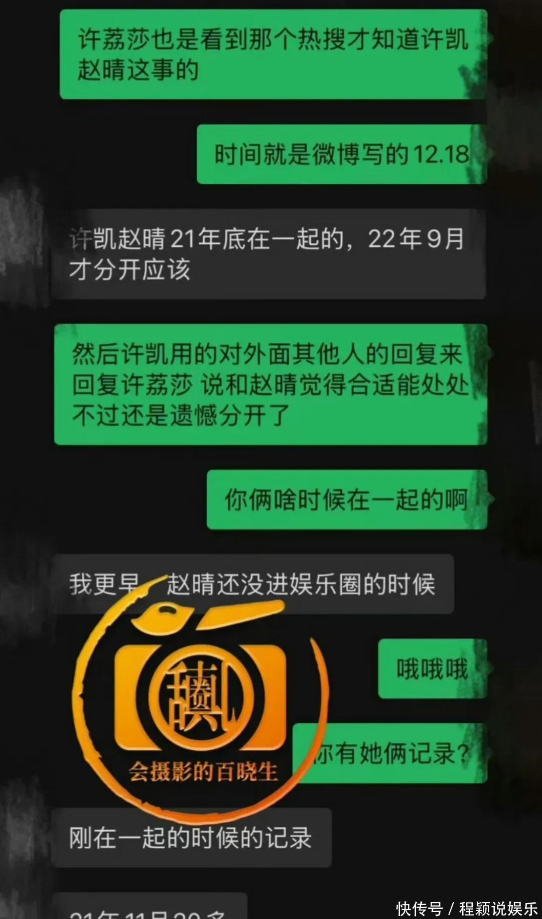 许凯和赵晴这瓜啊,尽然还有下文!之前消停了一阵儿,效果又有新动静。这不,疑似赵晴前男友的毛飞廉爆出来一堆聊天纪录。他说啊,在赵晴还没进文娱圈发展之前,他俩就在谈恋爱。好家伙,这赵晴倒好,恋爱技巧尽然劈叉许凯。更离谱的是,归拢时候许凯也不真诚,又劈叉许荔莎。这许凯和赵晴,妥妥的双重劈叉啊!