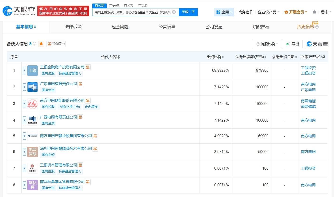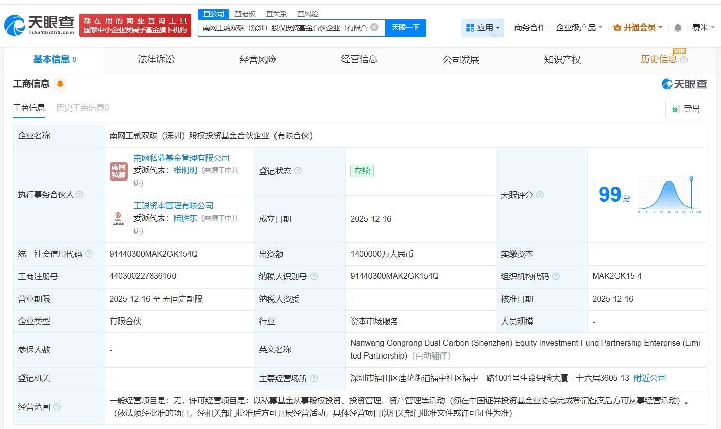 【大河财立方音讯】天眼查App清楚,12月16日,南网工融双碳(深圳)股权投资基金合资企业(有限合资)缔造,执行事务合资东说念主为南网私募基金惩办有限公司、工银本钱惩办有限公司,出资额140亿东说念主民币,标的畛域为以私募基金从事股权投资、投资惩办、财富惩办等步履,由工银金融财富投资有限公司、南网储能(600995)、 广东电网有限背负公司等共同出资。
