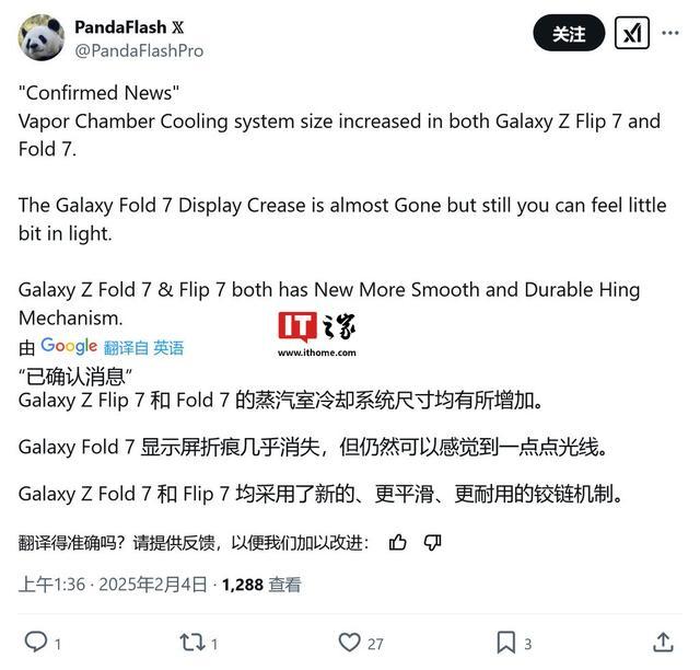 音书源还清晰 Galaxy Z Fold7 和 Galaxy Z Flip7 两款折叠手机均招揽了新的、更平滑、更耐用的搭钮机制,且 VC 均热板的面积进一步增多。